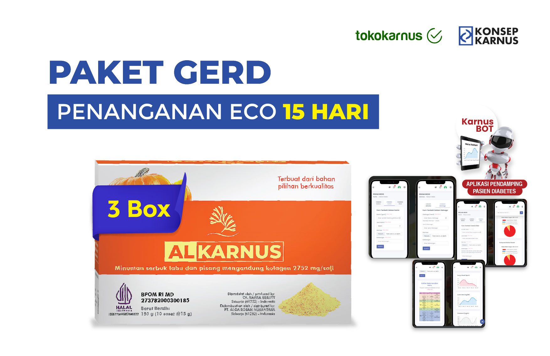 Alga Gold Cereal AG Karnus merupakan makanan kesehatan yang disiapkan untuk menangani kelainan metabolisme dan penyakit degeneratif, antara lain : Gangguan Pencernaan, Gangguan peredaran darah, Hipertensi, diabetes, Asam urat, Stroke, Gangguan ginjal, Tumor dan kanker.